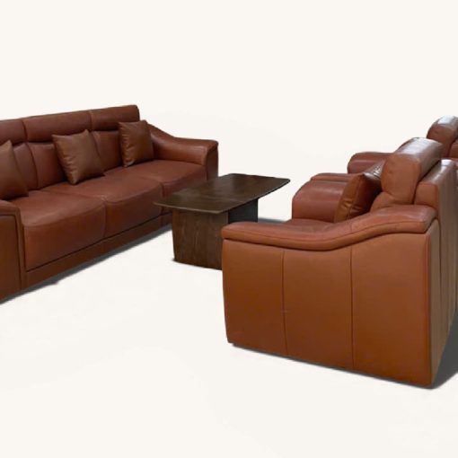 Bộ sofa da thật được thiết kế theo phong cách hiện đại pha chút cổ điển, các đường nét vuông vắn, chắc chắn nhưng không thô cứng. Phần tựa lưng cao vừa phải, tay ghế bo tròn mềm mại giúp tổng thể sofa trở nên hài hòa và dễ phối với nhiều phong cách nội thất.