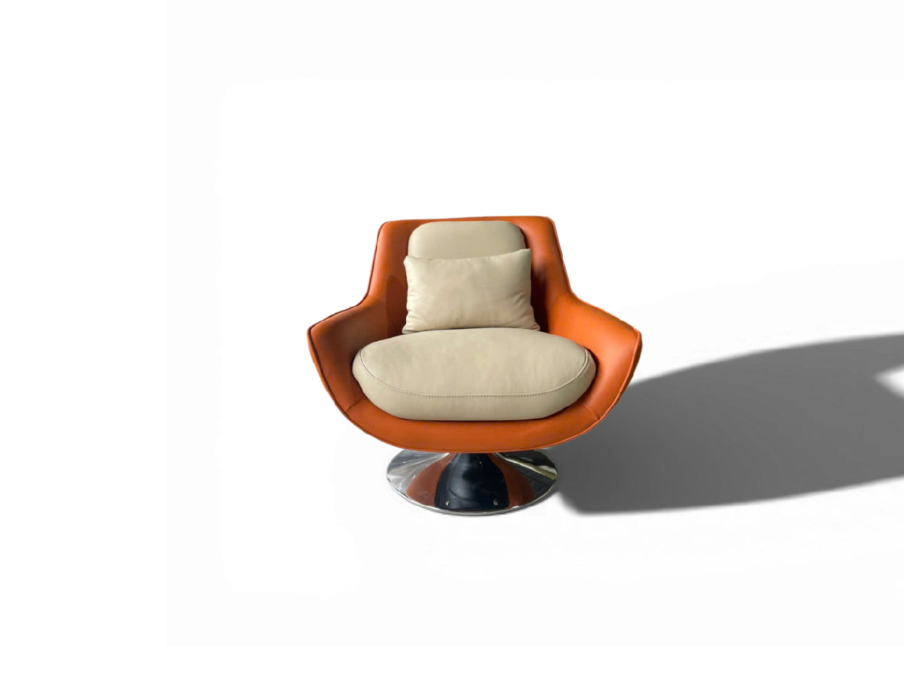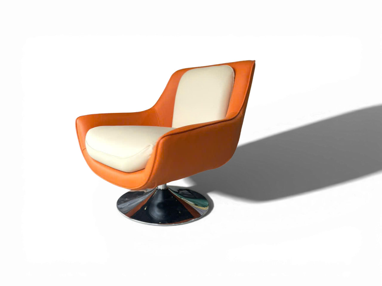 Ghế armchair xoay này sở hữu dáng ngồi rộng rãi, phần tay vịn và lưng tựa liền khối bo cong mềm mại, giúp ôm trọn cơ thể, mang lại cảm giác thư giãn tuyệt đối. Màu cam nổi bật kết hợp nệm ngồi kem tinh tế, tạo điểm nhấn độc đáo trong không gian.