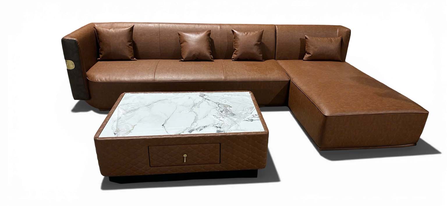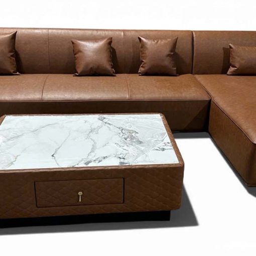 Bộ sofa chữ L bọc da hiện đại đi kèm bàn trà mặt đá sang trọng, thiết kế đồng bộ về kiểu dáng và màu sắc. Bàn trà tích hợp ngăn kéo tiện lợi, giúp lưu trữ đồ dùng gọn gàng, góp phần giữ cho không gian phòng khách luôn ngăn nắp và tinh tế.