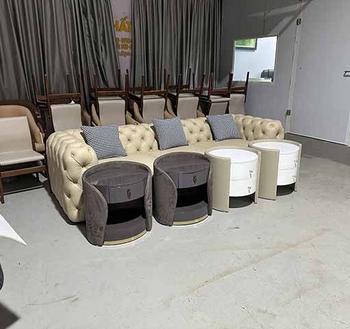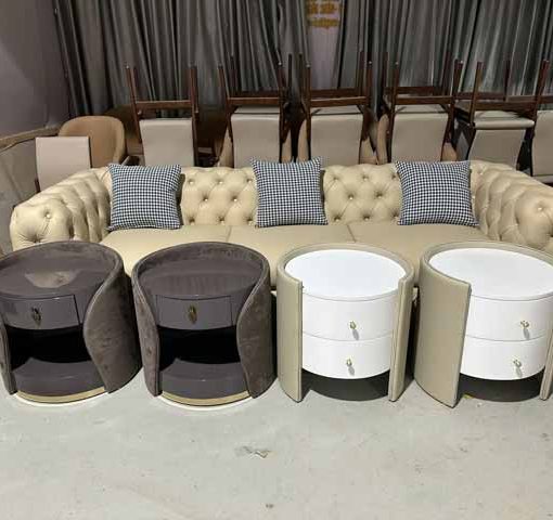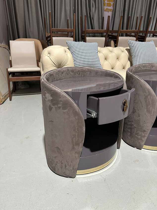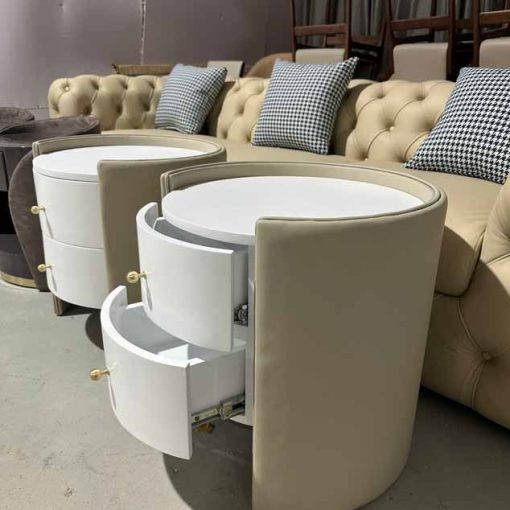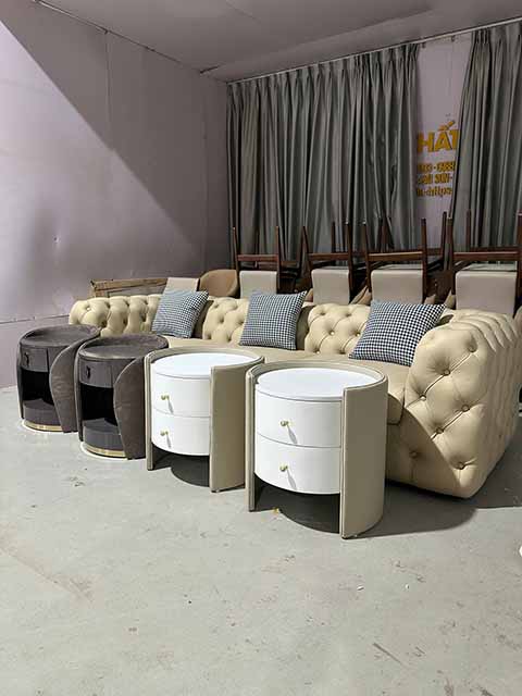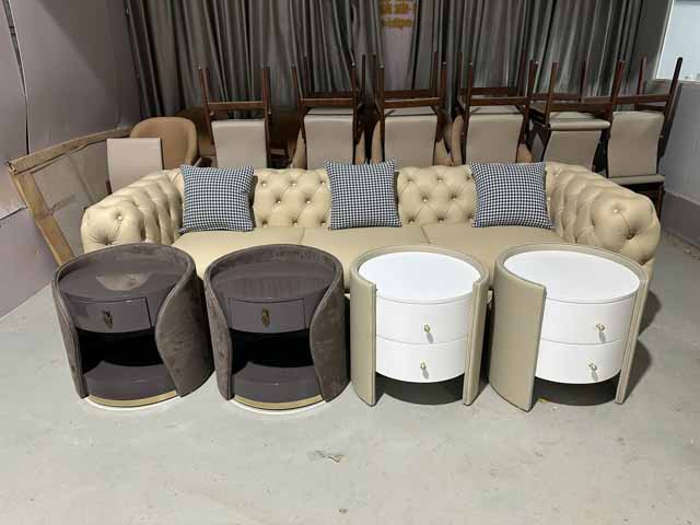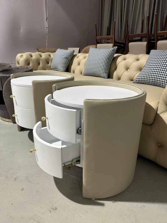 Bốn chiếc tủ đầu giường bọc da trong hình là minh chứng cho sự tỉ mỉ và độ hoàn thiện cao trong sản xuất của Nội Thất Đào Gia. Mỗi chiếc tủ đều mang dáng bo cong hai bên, tạo cảm giác mềm mại và thân thiện, đồng thời tăng tính an toàn cho người dùng, đặc biệt trong không gian phòng ngủ.
